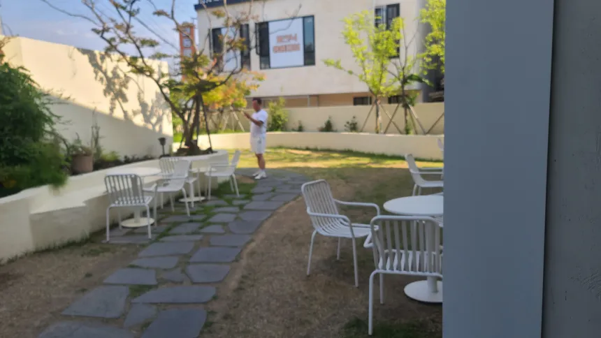 정면에 작은 조경(나무와 풀, 돌)이 있어 단순히 건물만 있는 게 아니라 여백과 여유를 느낄 수 있게 했다. 카페 내부도 탁 트인 구조일 것 같은 기대감을 줬다.