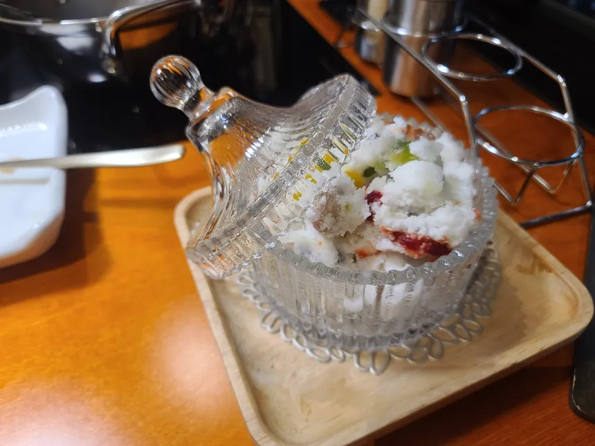 디저트로 나온 백설기. 땅콩이랑 곶감류?.. 이런 게 들어가 있는 거 같다. 알록달록 이쁘다.
