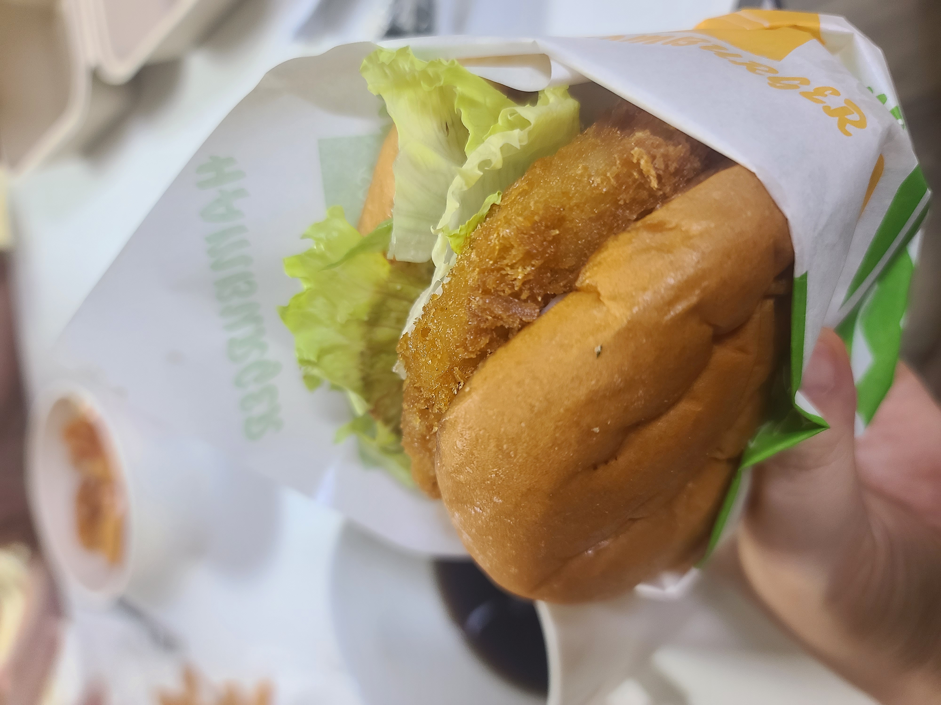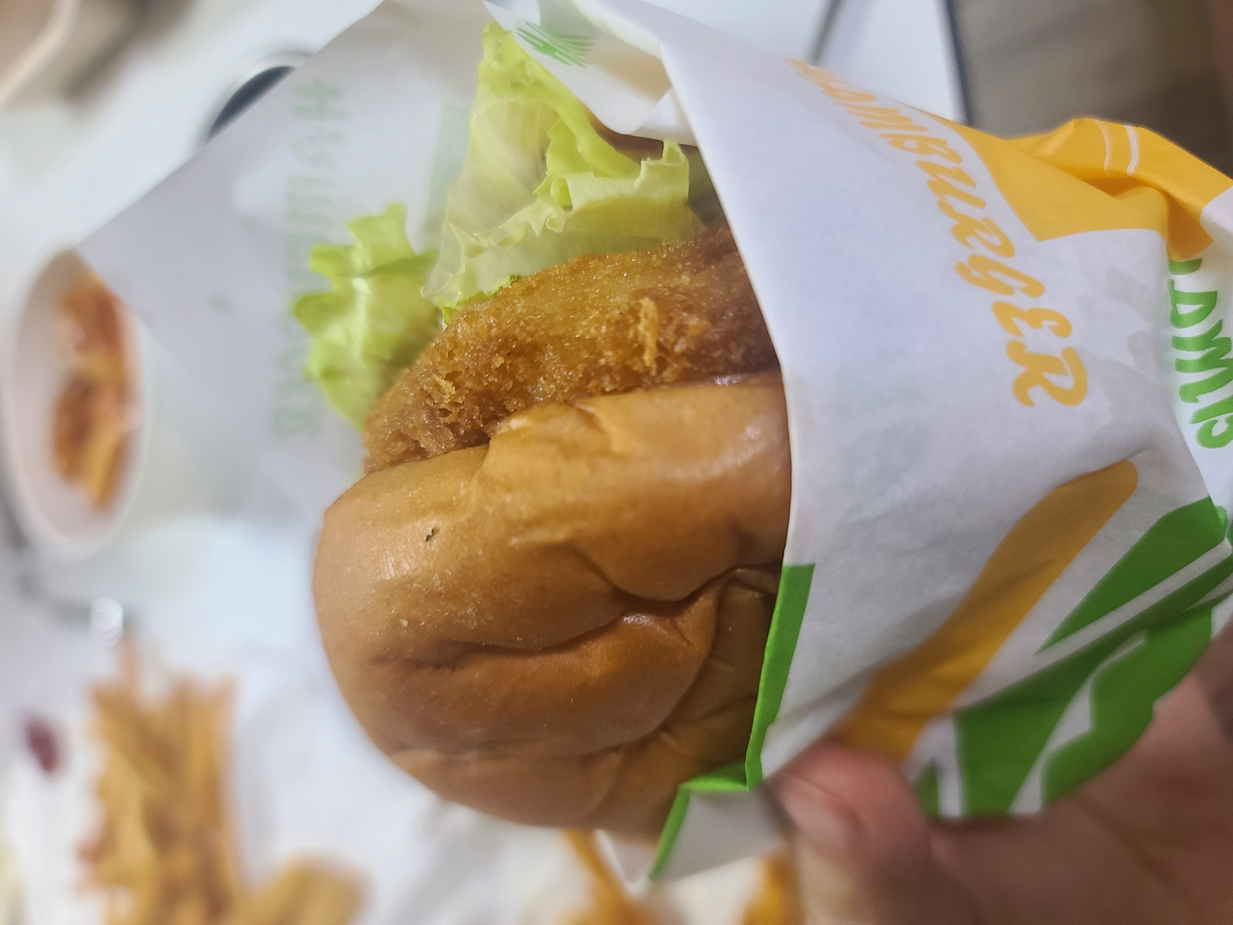 치킨버거 - 매운맛 밖에 없어서 기본소스로 넣어달라고 했다.