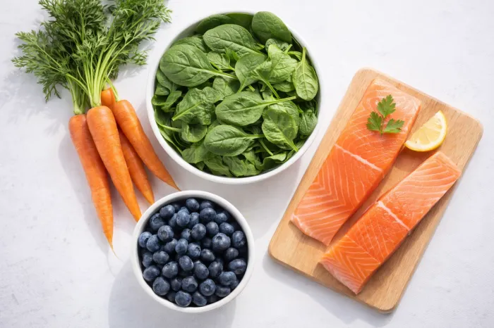 비타민 A, 루테인, 오메가-3가 풍부한 음식을 섭취하면 눈 건강에 좋습니다. 당근, 시금치, 연어, 블루베리 등을 꾸준히 먹는 습관이 필요합니다.