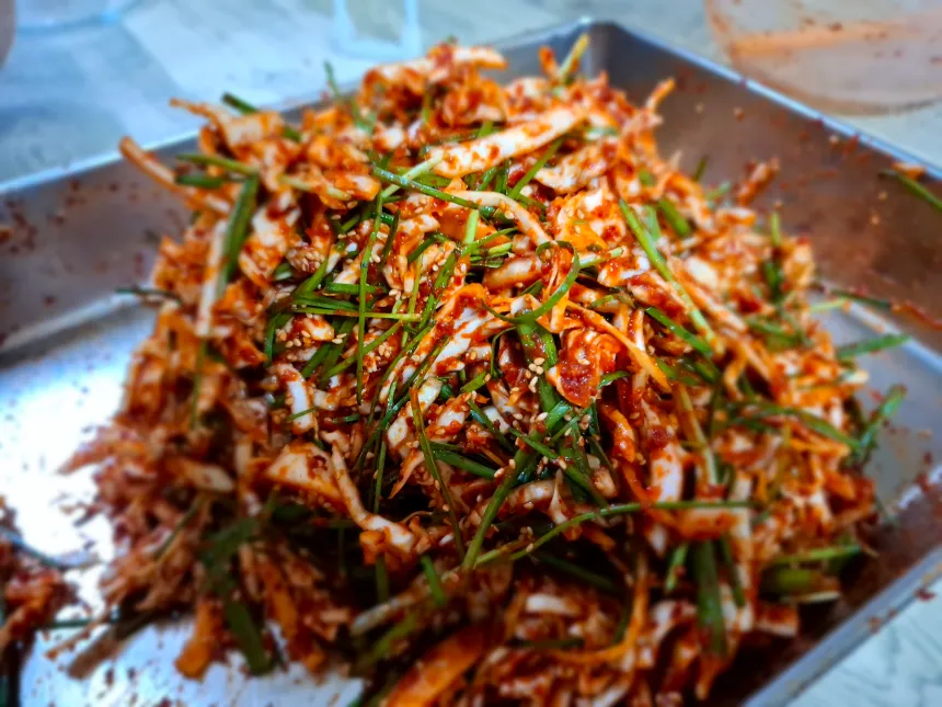 물기 뺀 양배추에 고추가루까지 섞어둔 양념장을 넣고 손으로 가볍게 버무려 주세요. 이때 너무 세게 무치면 양배추가 부서지니 살살~ 버무려주세요. 양념이 골고루 잘 섞였으면 쪽파나 대파 그리고 통깨를 넣어서 한 번 더 버무려줍니다.